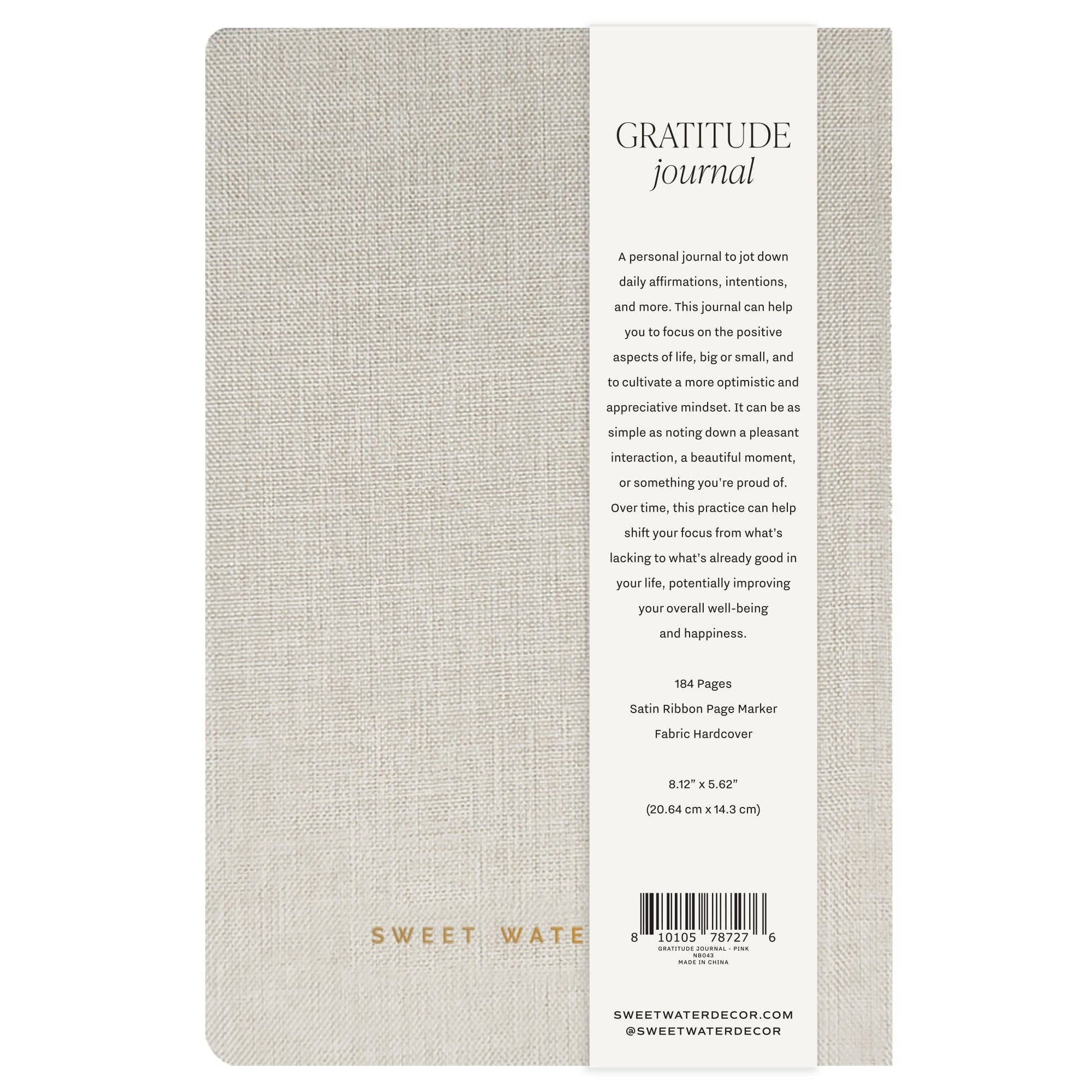 A personal journal to jot down daily affirmations, intentions and more. This journal can help you to focus on the positive aspects of life, big or small, and to cultivate a more optimistic and appreciative mindset. It can be as simple as noting down a pleasant interaction, a beautiful moment, or something you're proud of. Over time, this practice can help shift your focus from what’s lacking to what’s already good in your life, potentially improving your overall well-being and happiness. DETAILS: • Size: 5.75" x 8.25" x .65" • Design: Gratitude Journal (with prompts) • Tan Fabric Journal with Gold Foil Details • 100gsm Uncoated Lined Paper • Satin Ribbon Bookmark • 184 pages front and back - 1 Year of Prompts