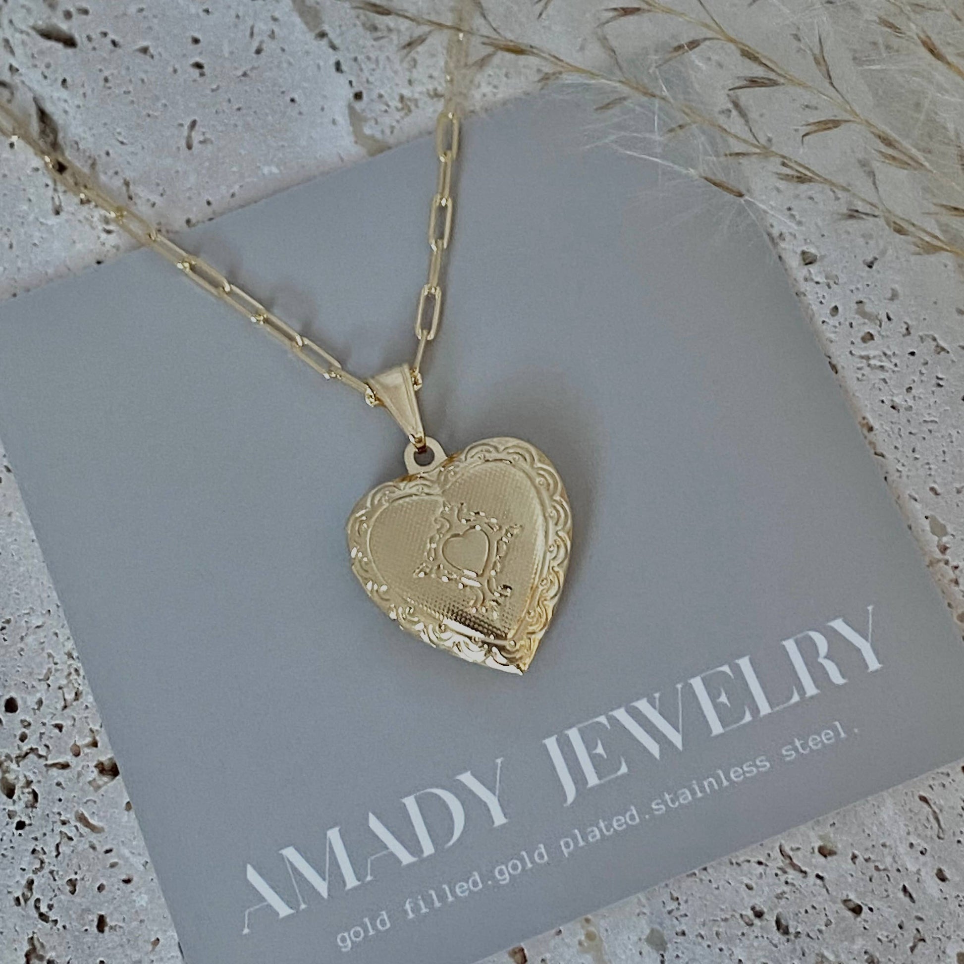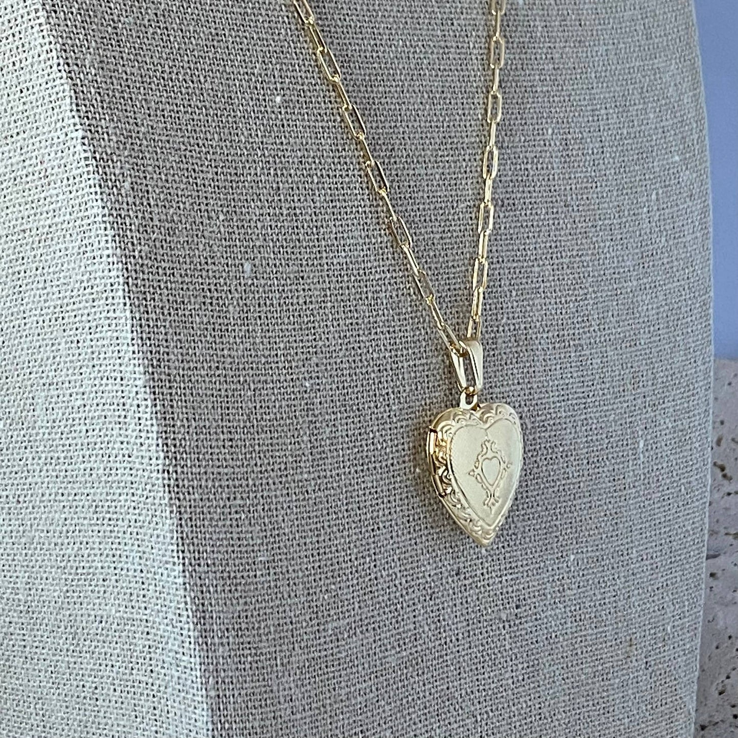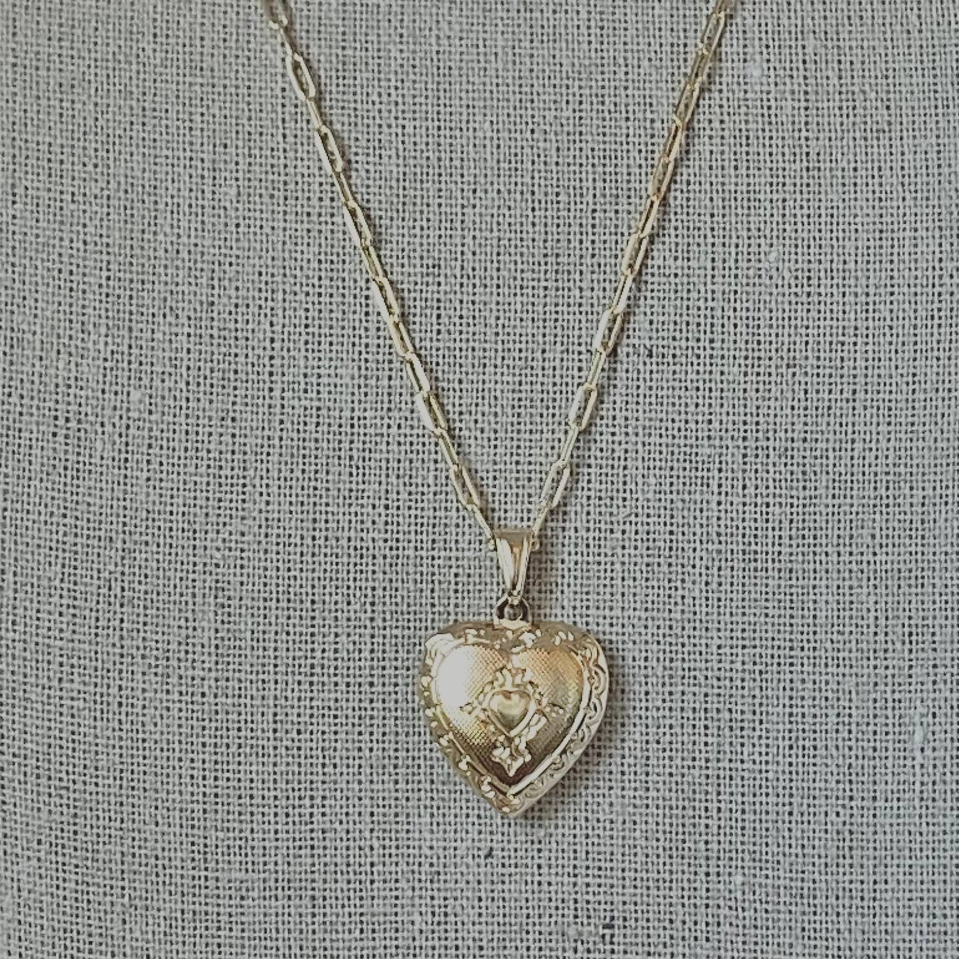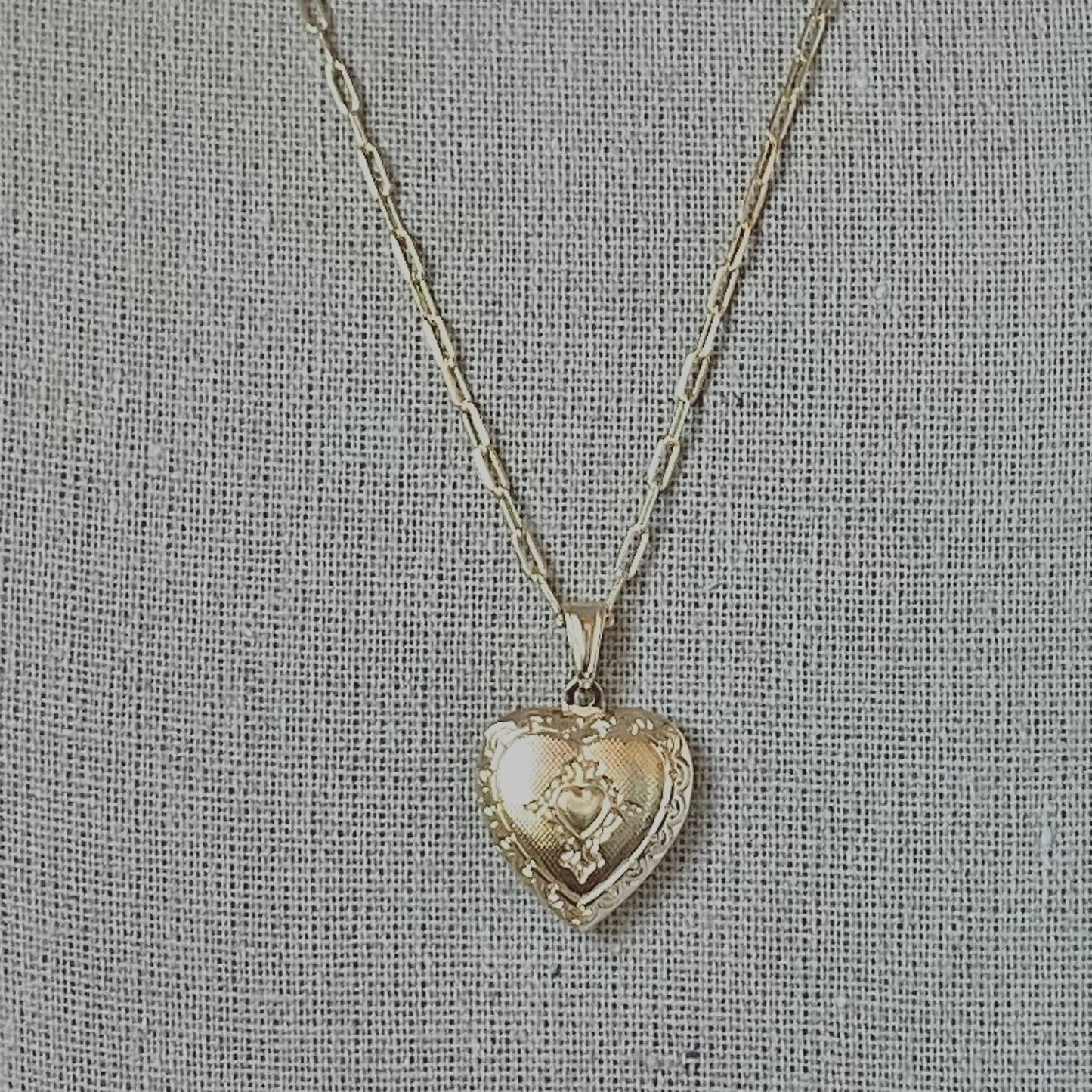 ♡ Heart Lock / Locket charm/pendant with cute details engraved on it, attached to a 18" length paperclip chain.
