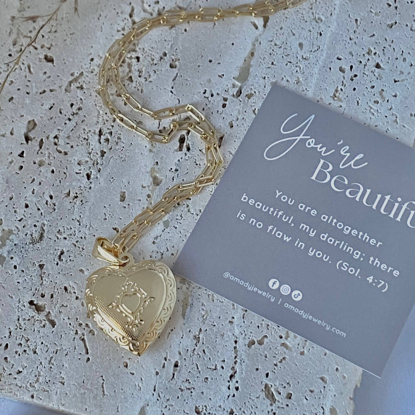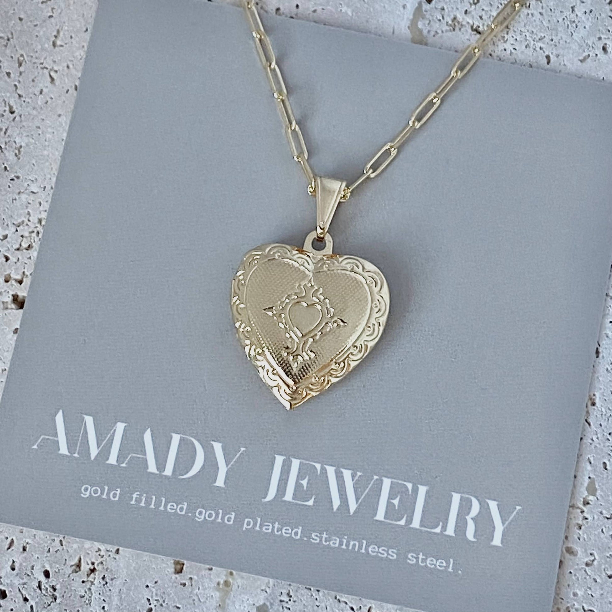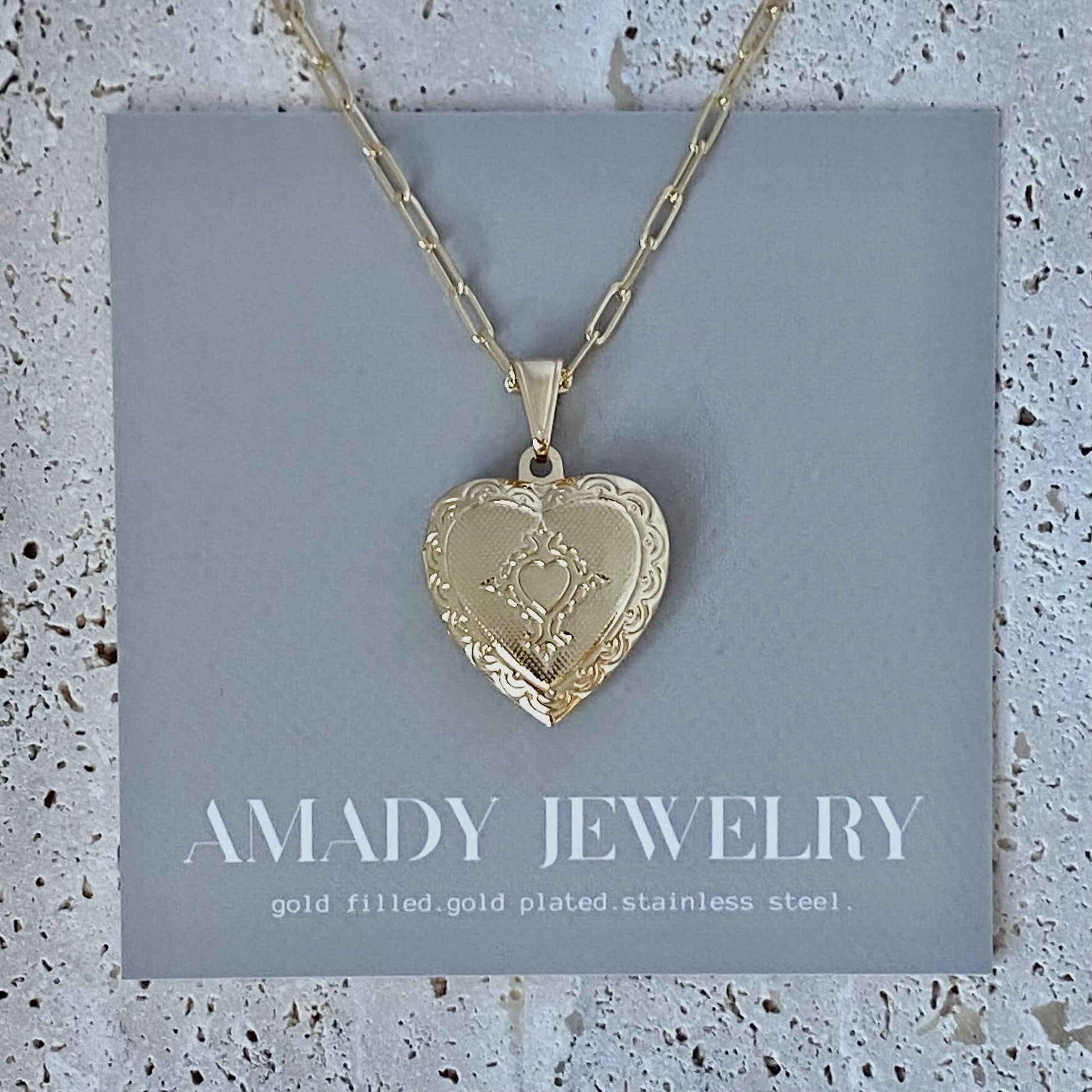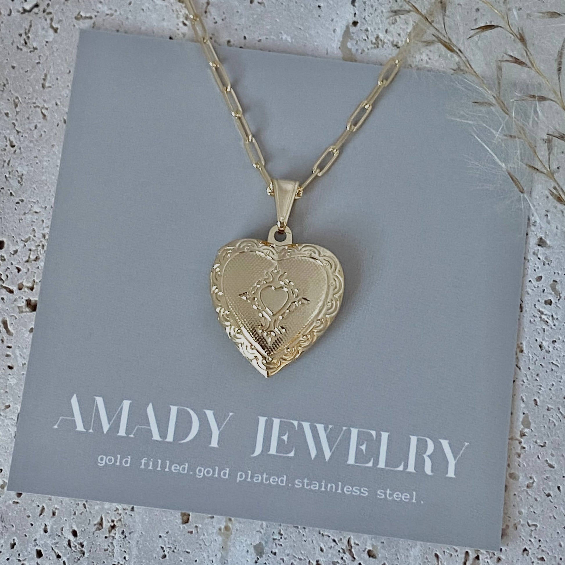 ♡ Heart Lock / Locket charm/pendant with cute details engraved on it, attached to a 18" length paperclip chain.