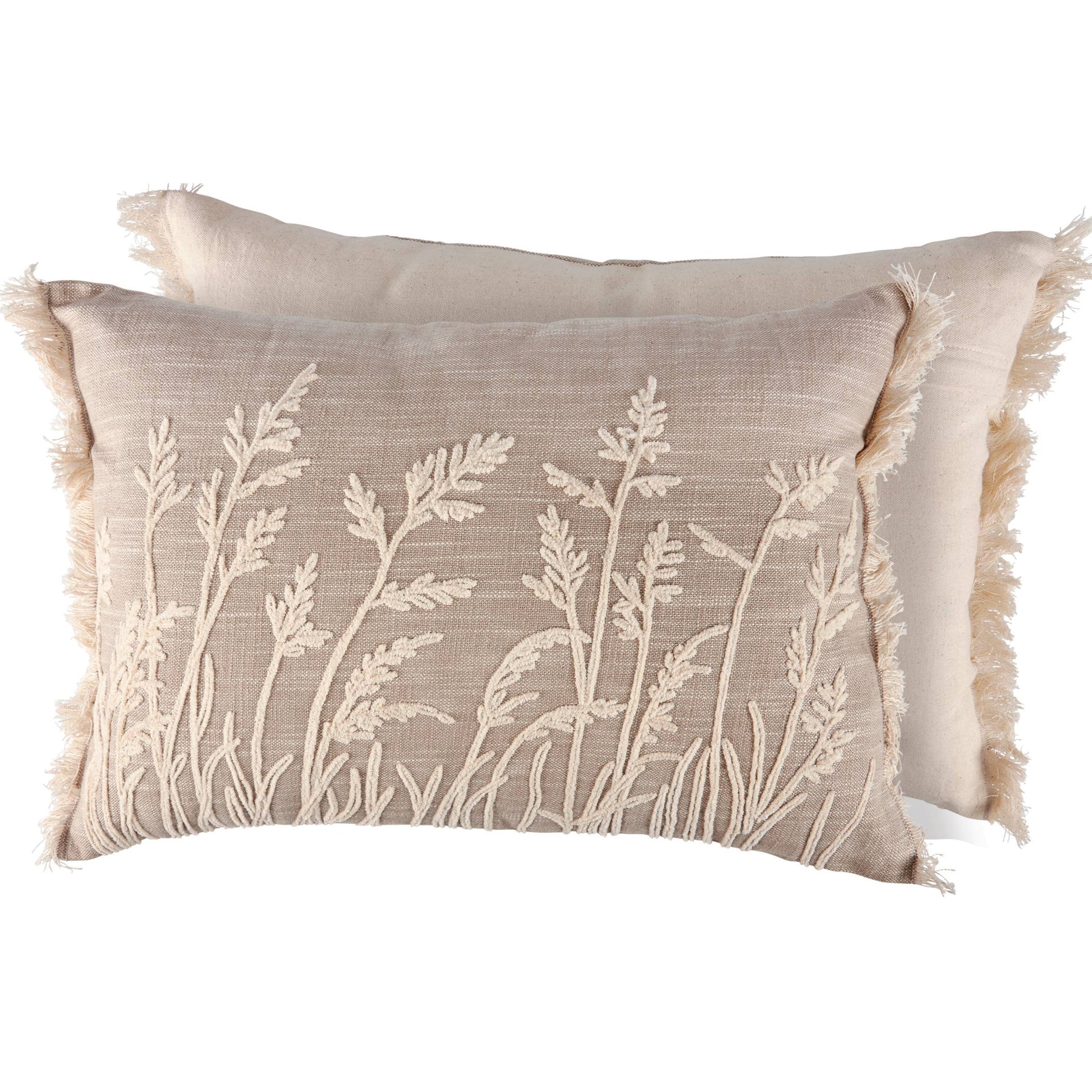 A decorative cream cotton pillow from our Cottagecore Collection displaying natural grass designs embroidered for added textures with fringe sides for a freeform style. Pillow features a zipper to easily remove and clean cover. A rustic everyday home accent that coordinates with a variety of décor.