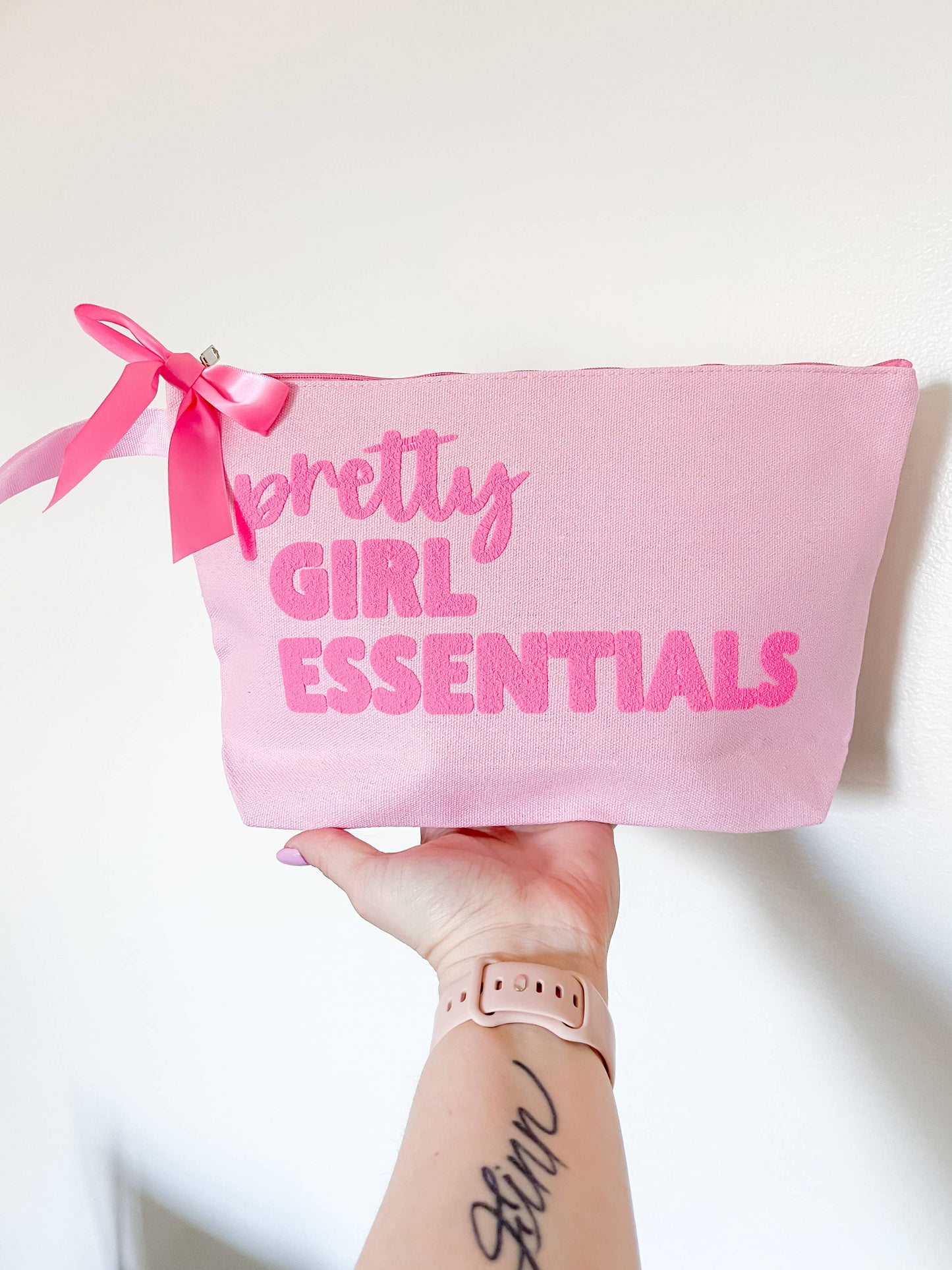 Introducing our cutest addition to our canvas bags - our Pretty Girl Essentials! Take your style on the road with these bow adorned, cute pink bags! With loveable puffy letters and durable canvas material, you can easily go from beach to bar without missing a beat! An easy-to-carry option for all your little accessories!